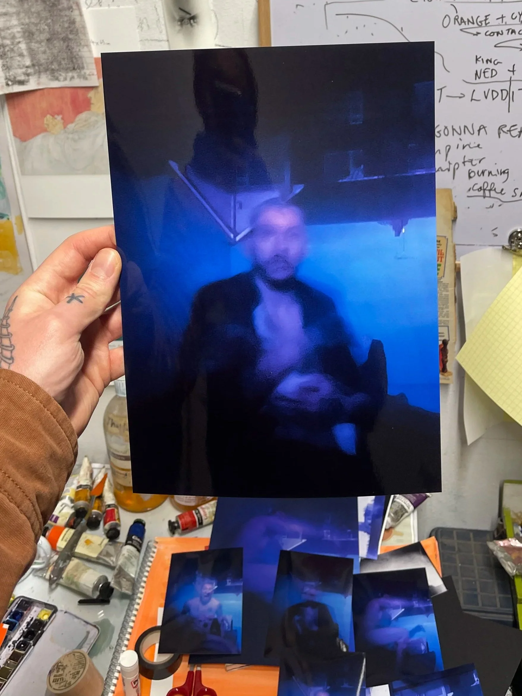 Today I made some prints on high quality inkjet photo paper to see what my latest experimental photographs would look like in the physical realm. My printer was playing up yesterday when I was trying to print black and white, it kept printing blue until I tricked it into thinking I was printing on plain paper and then it didn’t use composite black made of all the colours, just the black ink. The problem with the composite black is that the yellow ink seems to be blocked, which is why these colour prints I made today are accidentally blue.