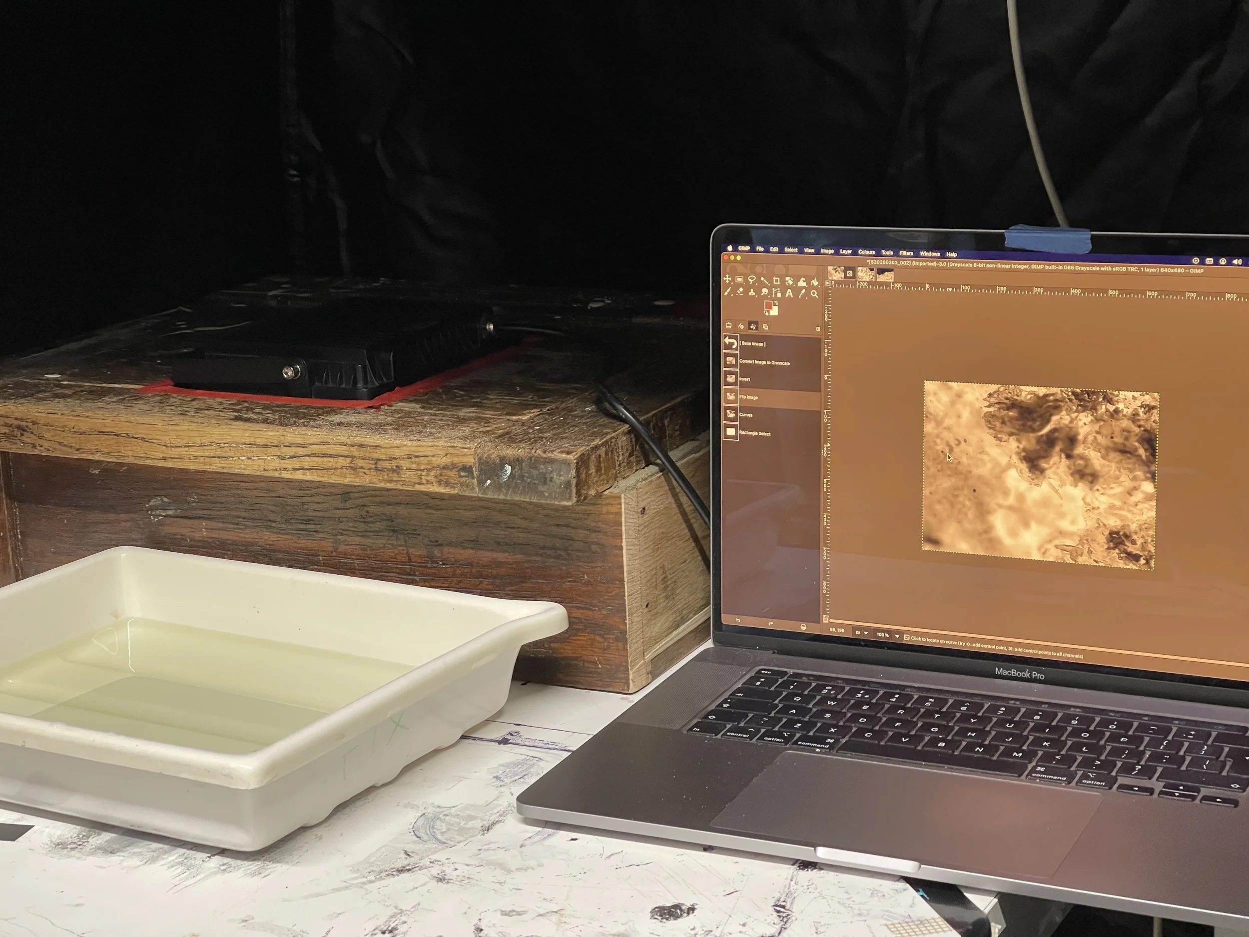 Imbedding or situating the artworks to the place the materials and data originate, I call this mapping. The first examples here are made by exploring and finding raw material, manipulating it to make it workable as a pigment and taking micrographs of the pigment/raw material to use in the physical artwork. Digital negatives are created of micrographs using open source editing software, then I print that on a transparency to contact print on sensitised paper in my exposure unit. Extending this further, using pigments made into paint, which I will be researching and developing in the coming weeks as I’d like to explore making watercolours and egg tempera.