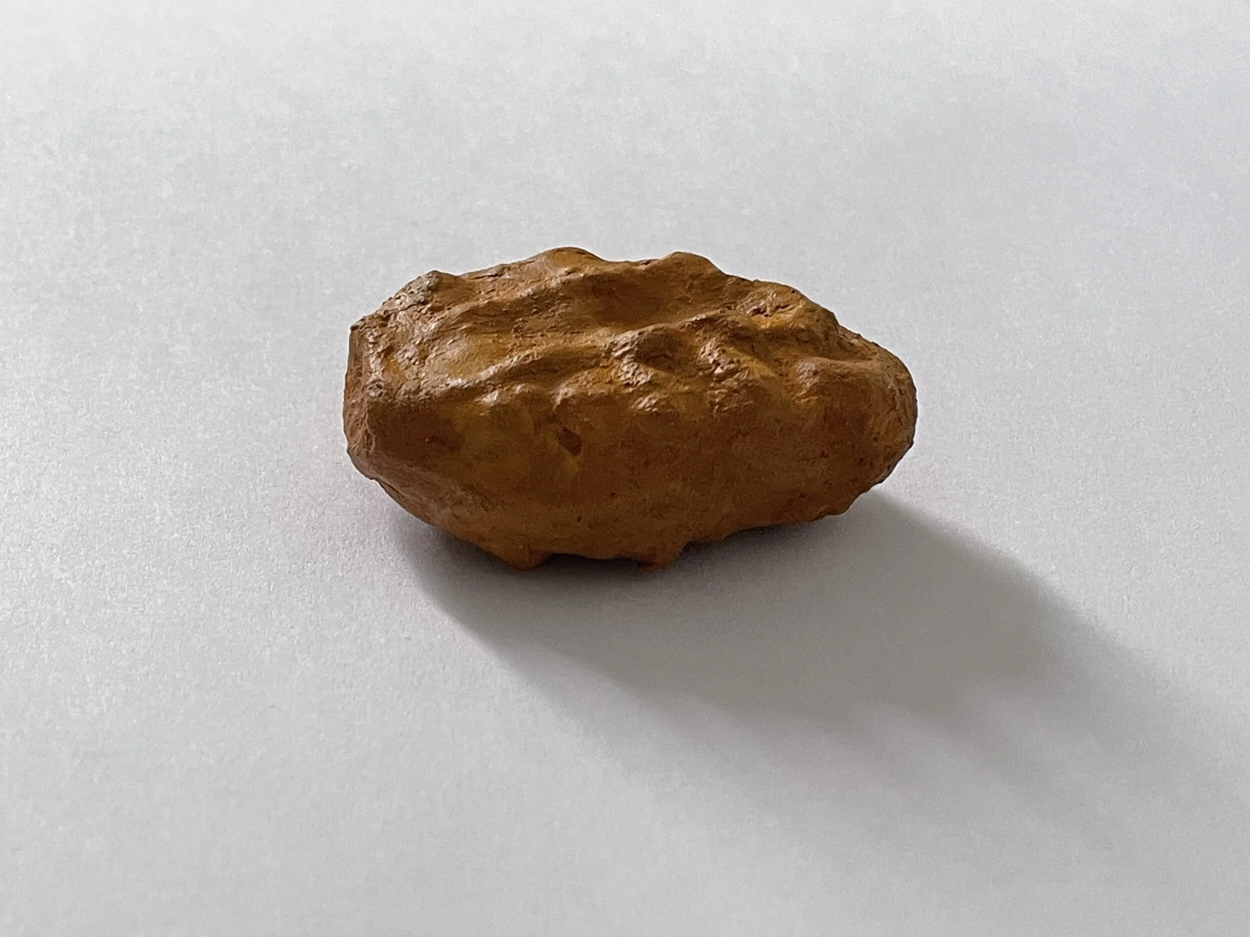 Here is a Nugget brush GIF I made from a PNG image I animated in Davinci Resolve. The Nugget brush is an art object exploring the idea of value, labor, and painting, using humor to do so. The brush is made from terracotta clay I dug up which I then levigated, deflocculated, and poured into a mold made from a real chicken nugget. After drying, I fired it to turn it into terracotta, then crafted the ferrule from a discarded Pepsi Max can and used my hair for the bristles. The terracotta is painted with acrylic paint to give it a plastic and fake appearance. This labor-intensive process created a tool that has no practical use as a paintbrush; it is not springy or firm enough to use with paint, and it is also not strong. To show the ineffectiveness of this tool, I decided to animate it and create a GIF.